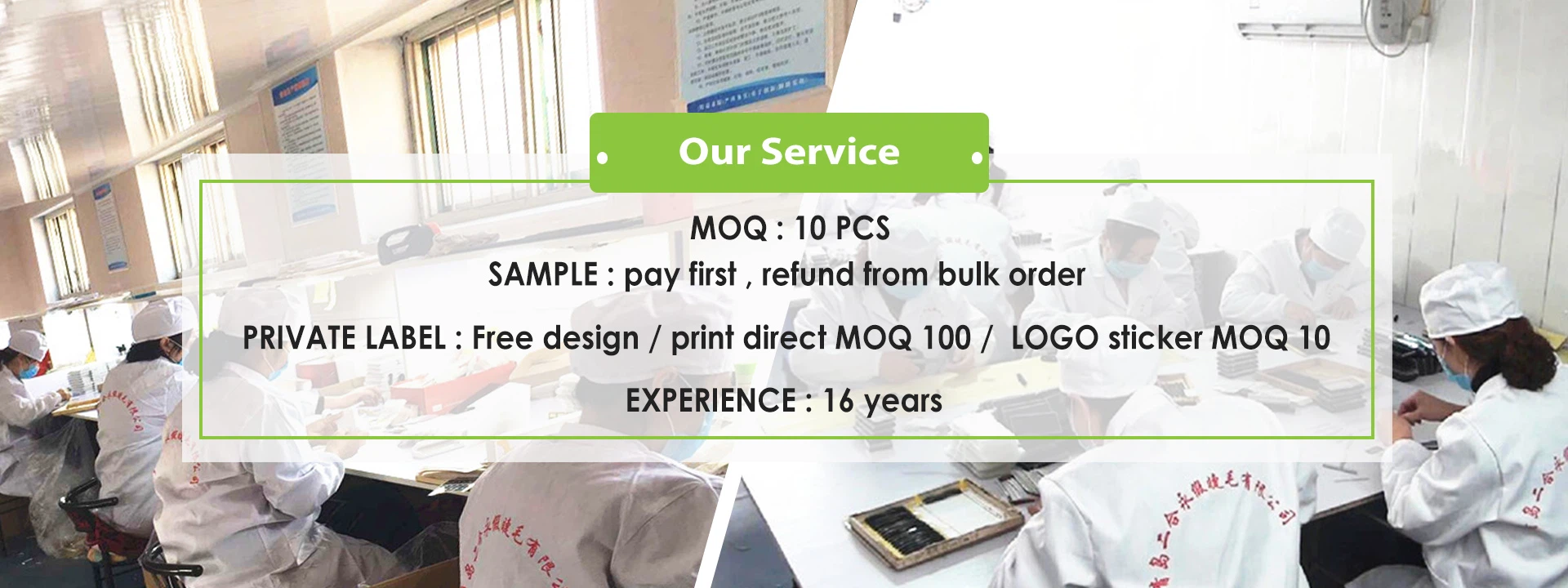 ہم نے 2006 سے لیش فیکٹری کا آغاز کیا، ہم اپنی فیکٹری سے تمام آئی لیش تیار کرتے ہیں، نیم سے تیار آئی لیش سے لے کر تیار آئی لیش تک، آئی لیش ایکسٹینشن پروڈکٹس کی 5 اقسام کی تیاری میں مہارت رکھتے ہیں: کلاسک آئی لیش، والیوم آئی لیش، میگا والیوم آئی لیش، انفرادی آئی لیش کلسٹرز، برونی کو بھی مکمل سٹرپس کرتا ہے، اور باقاعدگی سے بہت سے نئے لیش اسٹائل تیار کرتا ہے۔
